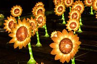 Zonnebloemen van Van Gogh, een ode aan het werk van schilder Van Gogh. Lichtgevende zonnebloemen in een donkere ruimte.