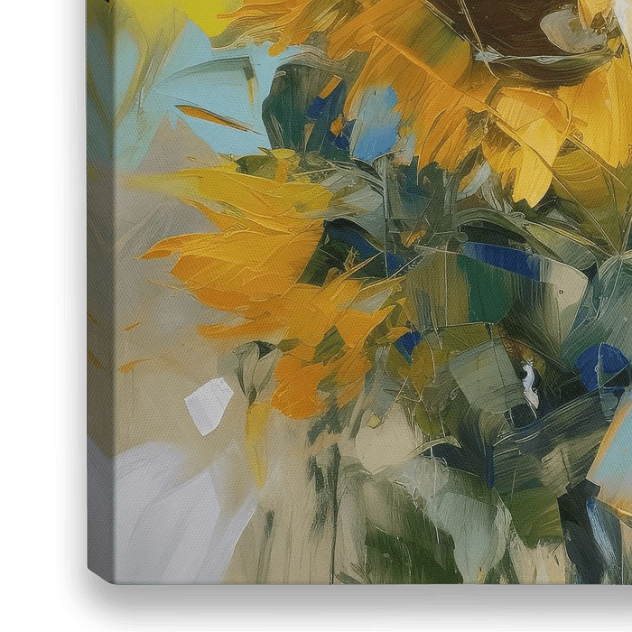 Deze afbeelding toont zonnebloemen in volle bloei, waarbij de warme gele en gouden tinten een energieke en vrolijke sfeer creëren. De gedetailleerde weergave van de bloemen brengt hun schoonheid tot leven en zorgt voor een levendige uitstraling. Het contrast tussen de levendige kleuren en de achtergrond voegt een extra dimensie toe,…