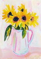 Zonnebloemen in wit, roze en geel, met een lichte pastelachtergrond, olieverfschilderij, dikke penseelstreken, in de stijl van Henri Matisse, minimalisme, vlakke illustratie, gouache.