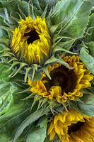 Drie zonnebloemen. Tussen hun groene bladeren. Een klein stilleven van de natuur. En als ik zonnebloemen zie denk ik aan Van Gogh.