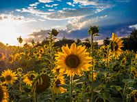 Zonnebloemenveld bij zonsondergang