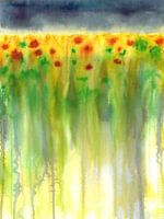 Sunflower Field Abstract is een schilderij in portretformaat geschilderd met waterverf en inkt door de kunstenaar Karen Kaspar. Het toont een veld met vele gele bloeiende zonnebloemen onder een donker indigoblauwe bewolkte hemel. Een zomers onweer nadert en regen is aan de horizon. De donkere lucht laat de gele zonnebloemen gloeien. Dit…