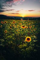 Koop dit landschapskunstwerk Zonnebloemveld in zonsondergang, zonnebloem landschap fotografie van Fotos by Jan Wehnert op canvas, aluminium dibond, (ingelijste) fotoprint, behang en ArtFrame, op maat geprint in Fine-Art kwaliteit.