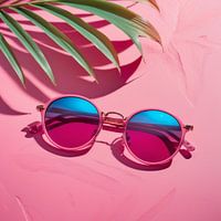 Zonnebrillen met een palmblad op een roze achtergrond zijn ontworpen om een vakantiegevoel en ontspanning over te brengen.