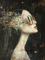 Zonnebril - In dit vrouwen schilderij zie je een vrouw met een gouden zonnebril, waarbij haar haar elegant stroomt en kleurrijke pixels als een digitale explosie om haar heen dansen, wat een moderne en stijlvolle uitstraling geeft aan het kunstwerk.