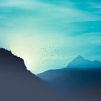 Een serene zonsopgang ontvouwt zich achter het silhouet van de bergen in de verte, terwijl een zwerm vogels sierlijk door de heldere lucht vliegt. De kalme blauwe tinten en het zachte licht creëren een rustgevende sfeer.