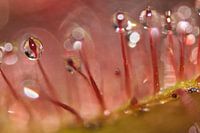 Op deze macrofoto is een zeer klein detail te zien van een zonnedauwplant. Op de achtergrond is veel bokeh zichtbaar, veroorzaakt door alle andere bolletjes van de plant en is slechts één bolletje op de voorgrond scherp.