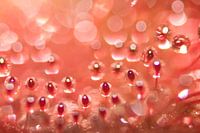 Op deze macrofoto is een zeer klein detail te zien van een zonnedauwplant. Op de achtergrond is veel bokeh zichtbaar, veroorzaakt door alle andere bolletjes van de plant en zijn slechts een paar bolletjes op de voorgrond scherp.
