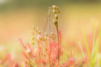 De kleine zonnedauw, Drosera Intermedia, heeft een waterjuffer gelokt om te verteren, in een natuurgebied in Strijbeek in Nederland.