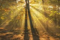 Zonneharpen bepalen het beeld in het speuldersbos bij Garderen rond zonsopkomst.