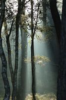 Toen wij langs de weg liepen viel mij ineens op dat het ochtendlicht aan de andere kant van de weg in prachtige banen door het bos viel.