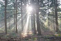 In de herfst, in een nevelig bos met naaldbomen, schijnen de zonnestralen tussen de bomen door. De nevel en de zonneharpen zorgen voor een geheimzinnige sfeer. De foto is gemaakt in een natuurgebied in Noord-Brabant in Nederland.