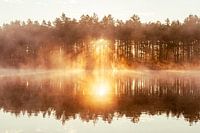 Prachtige zonsopkomst met de zonneharpen en een gouden mist aan het meer in Finland.