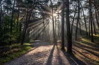 Koop dit moderne kunstwerk Zonneharpen op een bospad tijdens een mistige zonsopkomst van John van de Gazelle fotografie op canvas, aluminium dibond, (ingelijste) fotoprint, behang en ArtFrame, op maat geprint in Fine-Art kwaliteit.