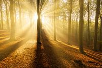 Herfst in het Nationaal Park Veluwezoom in Gelderland. Het is een prachtige mistige ochtend in het bos en de zon begint langzaam door de bomen heen te schijnen. Door de mist ontstaan er prachtige zonneharpen. Het licht van de zonneharpen steekt mooi af tegen de donkere silhouetten van de beukenbomen in het bos.