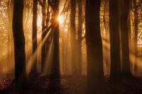 Herfst in het Nationaal Park Veluwezoom in Gelderland. Het is een prachtige mistige ochtend in het bos en de zon begint langzaam door de bomen heen te schijnen. Door de mist ontstaan er prachtige zonneharpen. Het licht van de zonneharpen steekt mooi af tegen de donkere silhouetten van de beukenbomen in het bos.