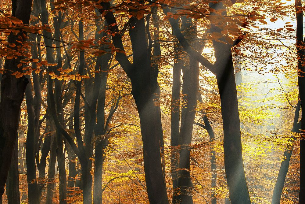 De dansende bomen van het Speulder- en Sprielderbos. een van de oudste bossen in Nederland met een magische mystieke sfeer. Herfst foto met prachtige intense kleuren tijdens een mistige ochtend vol najaarslicht op de wandelpaden.