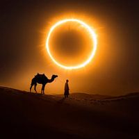 Een gouden hemelse gebeurtenis ontvouwt zich in het magische samenspel van licht en duisternis. Een eenzame reiziger met zijn trouwe kameel doorkruist de eindeloze zandduinen, terwijl de zonnekroon stralend boven hen uit schijnt. De eindeloze horizon omarmt de zachte golven van zand en de vereniging van mens en natuur creëert een…