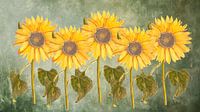 Vijf zonnebloemen bewegen speels in hoogte, als dansers in het zomerse licht. De levendige compositie brengt dynamiek in huis en verenigt klassieke bloemenschilderkunst met moderne elegantie. Een warme, natuurlijke blikvanger met karakter.