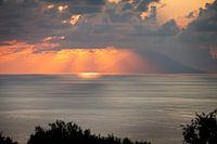 De zonnestralen komen achter de wolken vandaan om Stromboli te verlichten.