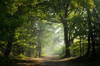 De zon verlicht een bospad op de Veluwe, Nederland.