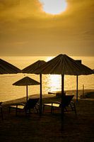 Porec strand aan de Kroatische Adriatische kust met parasols en ligstoelen op een typische kunstmatige badzone in de avond net voor zonsondergang