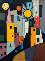 Abstracte compositie die een Provençaals dorp voorstelt onder intens zonlicht. Een klokkentoren met klok is afgebeeld. Het dorp ligt op een heuvel met kleurrijke gevels, wat het een pittoreske uitstraling geeft, typisch voor dorpen in Zuid-Frankrijk.