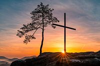 Een prachtige zonsopgang op de Rötzenberg. De gelegenheid was perfect om een zonnester te fotograferen aan de voet van het kruis en zo een speciale foto te maken