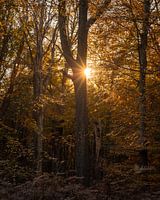 De foto toont de schoonheid van de natuur in het Liesbos te Breda. De ondergaande zon schittert door de bomen en zorgt voor een gouden gloed. De bomen zijn herfstig gekleurd met verschillende tinten oranje, bruin en geel. De zon staat laag aan de horizon waardoor er een mooi lichtval is. De foto laat de schoonheid en de stilte van het Liesbos zien.