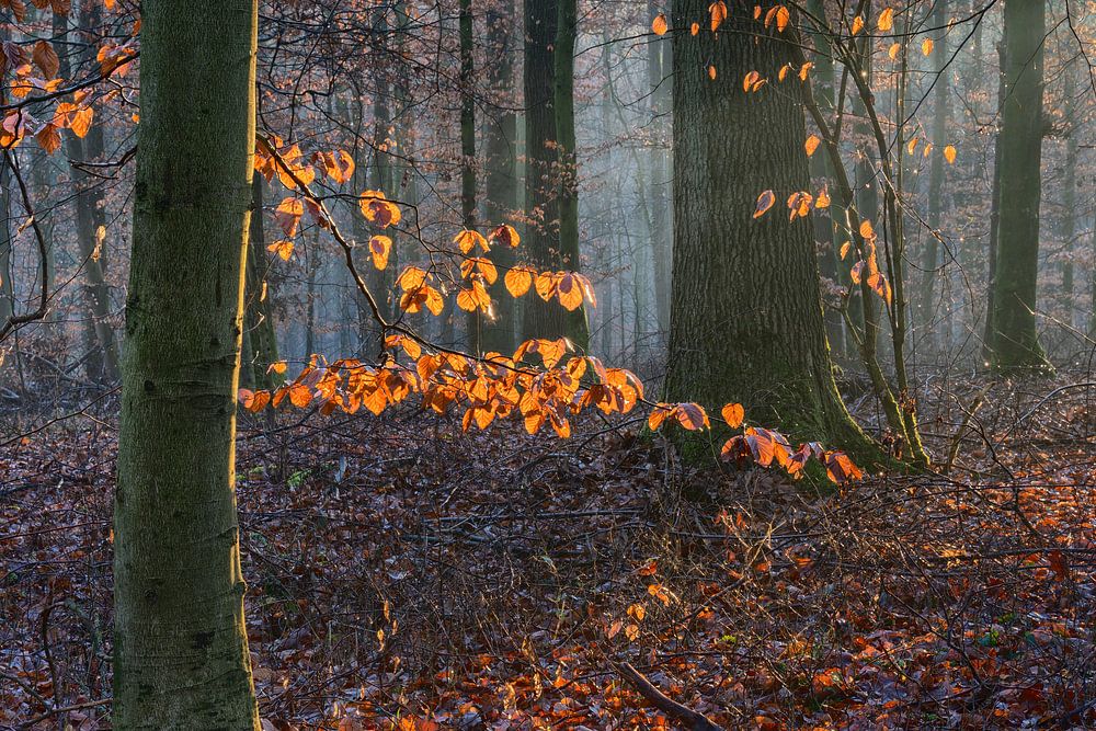 Mist en de lage winterzon roepen een bijzondere sfeer op met schaduwen en lichtstralen in het bos.