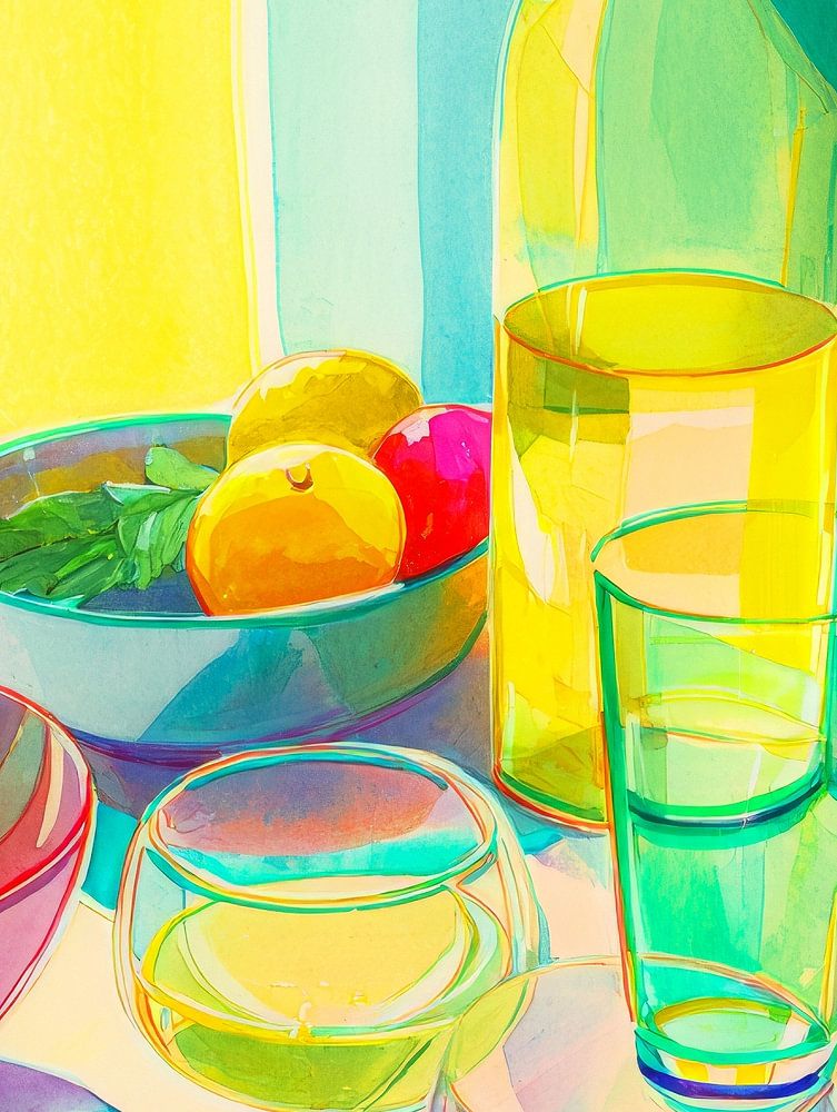 Deze sprankelende aquarel vangt een zomers tafereel waarin glazen, flessen en fruit baden in het warme zonlicht. De transparantie van het glaswerk en de levendige kleuren creëren een spel van licht en reflectie dat bijna magisch aanvoelt. Het werk is geïnspireerd door minimalisme en mediterrane eenvoud, maar bruist van leven en frisheid.