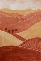Dit werk toont een serene weergave van glooiende heuvels onder de warme gloed van de zon. De lijnen van de heuvels zijn zacht en vloeiend, met subtiele schakeringen van rood en beige die de natuurlijke contouren van het landschap benadrukken. Vier bomen staan in de verte, een rustgevend element dat diepte en perspectief aan de compositie toevoegt. De eenvoud en harmonie van de kleuren en vormen creëren een kalmerende sfeer, perfect om een gevoel van vrede en stilte in een ruimte te brengen. Dit werk zou prachtig staan in een woonkamer of studeerkamer, waar het een gevoel van sereniteit en balans kan bevorderen.