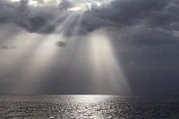 Zonnestralen boven de Atlantische Oceaan. De kenners herkennen de monding van de Surinamerivier.