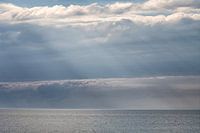 Boven een kalme zee schijnt de zon door het wolkendek. Een mooie subtiele zonneharp. De schuine zonnestralen kruisen de horizontale lijnen van wolkendek en zee. Zachte blauw tinten boven het grijs van de gladde zee. Een subtiel maar toch levendig beeld.