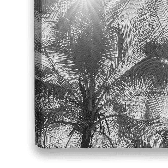 Ontsnap naar een tropisch paradijs met deze zwart-witfoto, getiteld "Zonnestralen door Tropisch Gebladerte". Deze afbeelding legt het spel van licht en schaduw vast dat ontstaat als de middagzon door de dichte bladeren van een majestueuze palmboom schijnt. De subtiele gradaties van licht en textuur brengen een serene atmosfeer en diepte in de afbeelding, waardoor het een ideale muurdecoratie is voor ruimtes die een natuurlijke en rustgevende uitstraling willen bevorderen. Perfect voor liefhebbers van natuurlijke schoonheid en fotografische kunst, het versterkt elk interieur met een vleugje kalme elegantie.