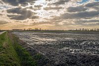 Sfeerbeeld van zonnestralen door de wolken boven een drassig veld in een Nederlandse polder bij het dorp Hooge Zwaluwe, gemeente Drimmelen, in de provincie Noord-Brabant. Het is een koude en bewolkte dag in het winterseizoen.