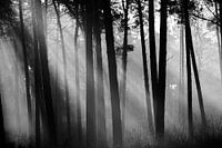 Op een mistige ochtend kwam de zon tevoorschijn. Het dennenbos werd een sprookjesbos met zonnestralen die door de boomtoppen heen straalden.