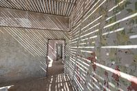 Deze volledig verweerde kamer is van een gebouw in Kolmanskop, Namibië. Het verlaten huis is dusdanig vervallen dat het zonlicht door het dak de kamer binnenvalt.