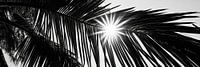 Een felle flits van zonlicht dringt door de gebogen palmbladeren en creëert een fascinerend spel van licht en schaduw. Het monochrome kleurenschema verleent de scène een tijdloze elegantie, terwijl de delicate randen van de bladeren in harmonieus contrast staan met het stralende centrum. Een moment van rust, gevangen tussen natuur en licht.