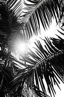 Een mystieke lichtstraal breekt door het dichte gebladerte, dat glanst in een diepzwarte kleur. De delicate palmbladeren vormen een levendig patroon terwijl ze het licht omlijsten als een natuurlijke sculptuur. Een samenspel van schaduw en licht voert de kijker mee naar een tropisch paradijs waar rust en warmte harmonieus samensmelten.