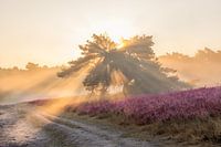 Een landschapsopname van een fraaie zonsopkomst op de prachtig bloeiende heide. De mist zorgt voor fraaie zonnestralen die breken door de spar en de prachtig bloeiende heide maakt het beeld compleet.