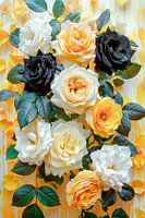 Dit schilderij is een levendige voorstelling van rozen die zich koesteren in een patroon van licht en schaduw. Te midden van de bloemenpracht staan rozen in verschillende tinten - van stralend wit tot delicaat crème tot diep mysterieus zwart. Elke bloem is bedekt met dauwdruppels die fonkelen als juweeltjes in het licht. Ze staan tegen een achtergrond die doet denken aan een zonnige dag, met gele kleurspatten die als zonnevlekken over een vloeiend wit oppervlak dansen. Het geheel doet denken aan een ontspannen dag in de tuin, waar het spel van licht en kleur de natuurlijke schoonheid van de bloemen benadrukt en een sfeer van warmte en welzijn creëert.
