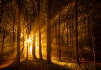 Een magische ochtend in het bos, de zonnestralen schijnen door de bonen en verlichten de mist in het bos. Het is herfst in Nederland en door de mist krijgt alles een gouden gloed.