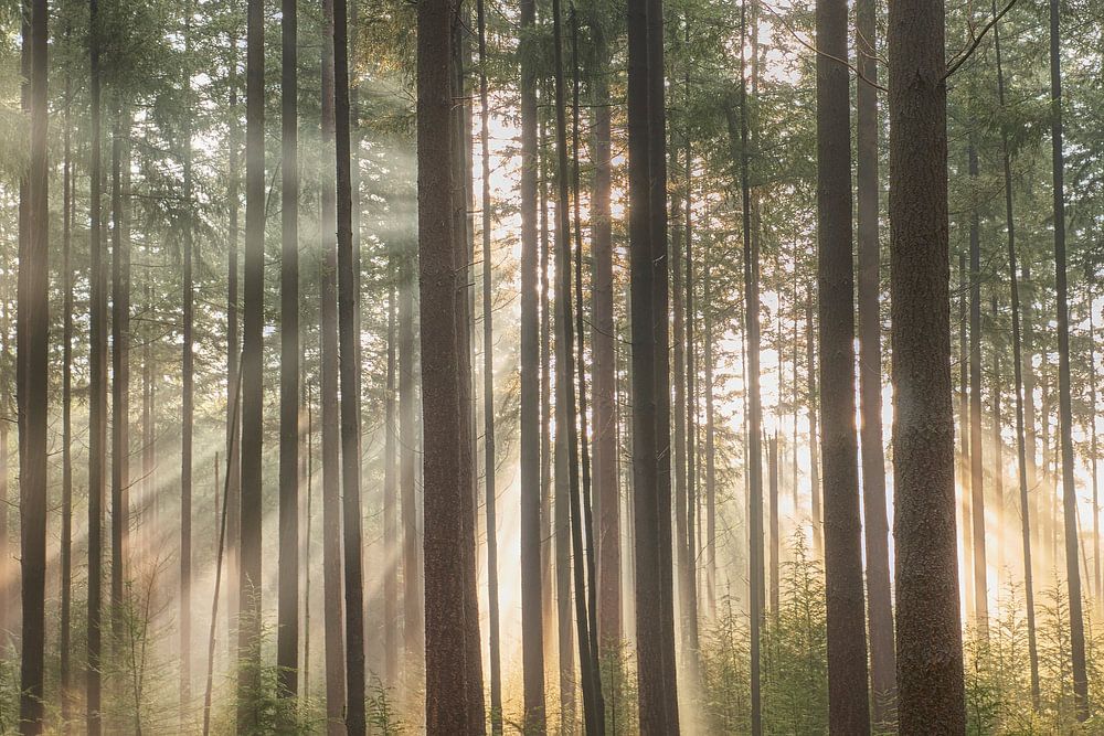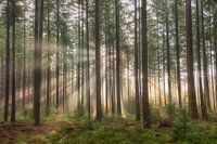 Een prachtige herfst ochtend in een prachtig dennenbos in de buurt van Apeldoorn op de Veluwe. Een beetje nevel en de doorbrekende zon zorgen voor een magische sfeer.