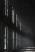 Deze foto toont een verlaten industriële ruimte met een rij grote, hoge ramen aan de zijkant. Het natuurlijke licht valt door de ramen, waardoor er een patroon van heldere rechthoeken op de donkere vloer ontstaat. Het licht onthult de verweerde muren en de leegte van de ruimte, wat een gevoel van verlatenheid oproept.