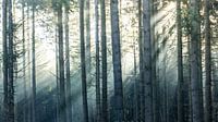 Zonnestralen schijnen door de boomtoppen tijdens een mistige morgen in een prachtig dennenbos.