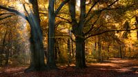 Zonnestralen, licht en schaduw spel in een herfst bos.