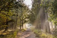 Twee wandelaars wandelen 's morgens vroeg door de zonnestralen in het bos van Nationaal Park Planken Wambuis in Ede op de Veluwe in Gelderland in Nederland
