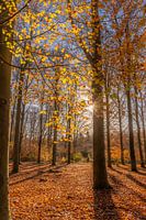 Prachtige kleurrijke zonnige herfstfoto van zonnestralen die door de herfstbladeren schijnen in het bos. De foto is genomen op de Woldberg, kop van Overijssel, Nederland.