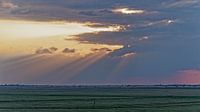 Dit prachtige vergezicht aan uw muur waarbij de zon mysterieus door de wolken schijnt en de stralen zichtbaar de aarde raken.
